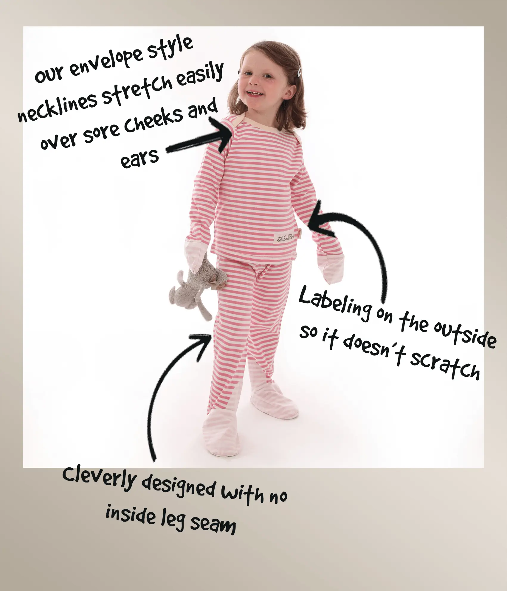 See how the ScratchSleeves PJs are designed to both stop little ones scratching themselves with fingers (and toes) and minimise the irritation from seams and labels.