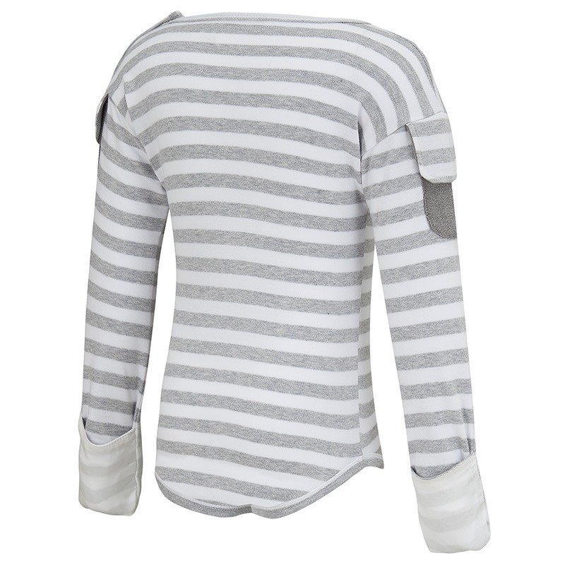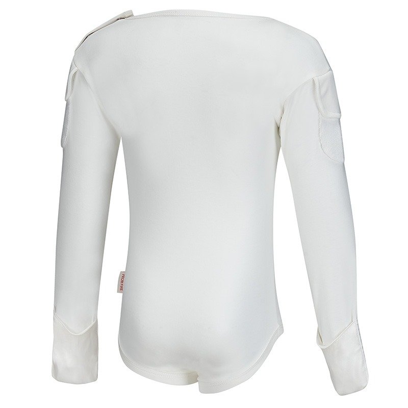 - When the mitts are open, our unique shoulder tabs enable the sleeves to be hitched up and out of the way, allowing your child to play without their cuffs getting in the way. These tabs use a novel fabric from GoodCatch which works like traditional Velcro but which is soft and flexible.
