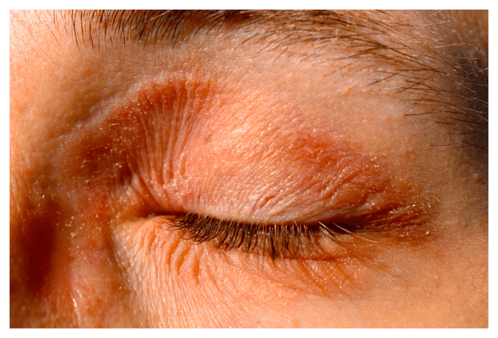 Eczema is an umbrella term that covers a number of inflammatory skin conditions characterised by itchy, dry skin, rashes, scaly patches, blisters and skin infections. Itching is the most common symptom. These conditions include atopic dermatitis, contact dermatitis, seborrheic dermatitis, varicose eczema, discoid eczema and pompholyx (or dyshidrotic) eczema. On lighter skin, eczema typically looks red and inflamed. On darker skin tones, eczema can look brown, purple, gray or ashen. These conditions affect around 2-10% of adults in the UK.